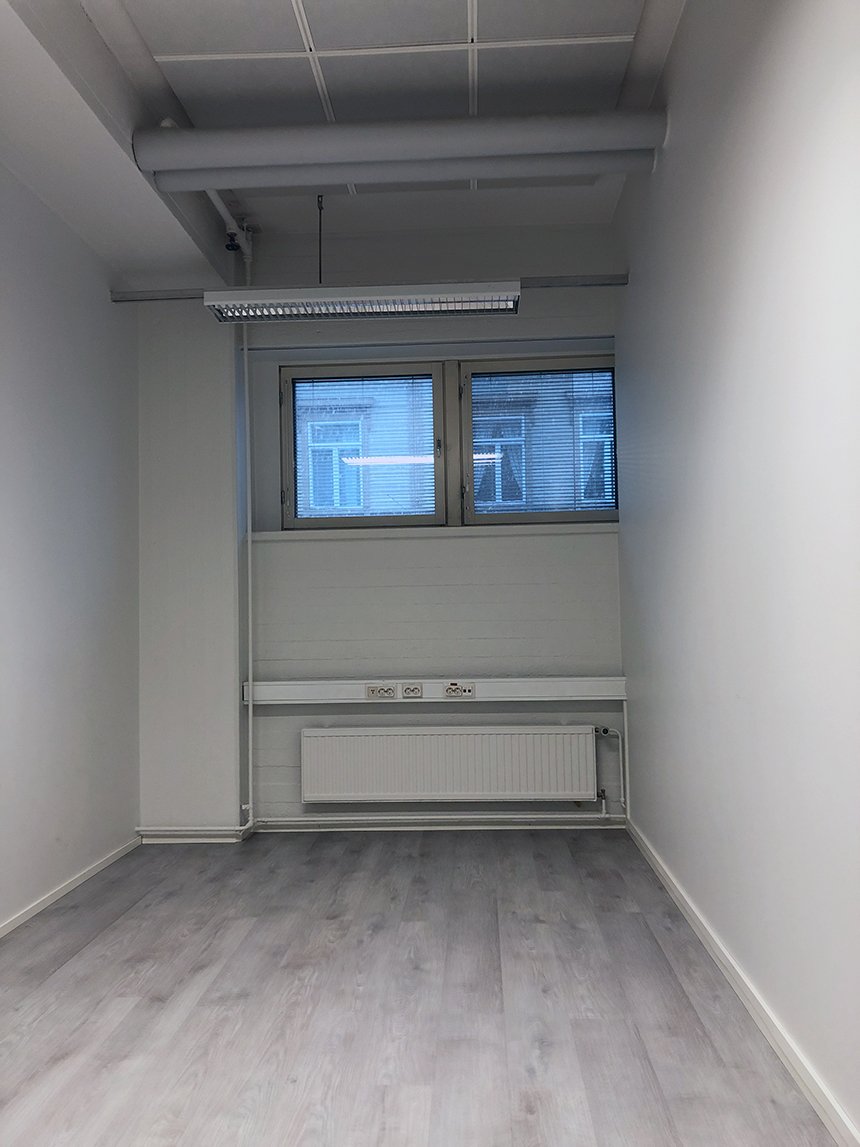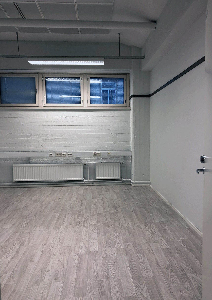 WSOYtalon 3. kerroksessa sijaitseva toimistohuone. Tilassa yläikkunat, joiden takana jalkakäytävä. Lähin sisäänkäynti Papinkadun puolelta. Käytävällä useita samanlaisia huoneita. Valokuvat toimistohuoneiden yleisiä esittelykuvia.