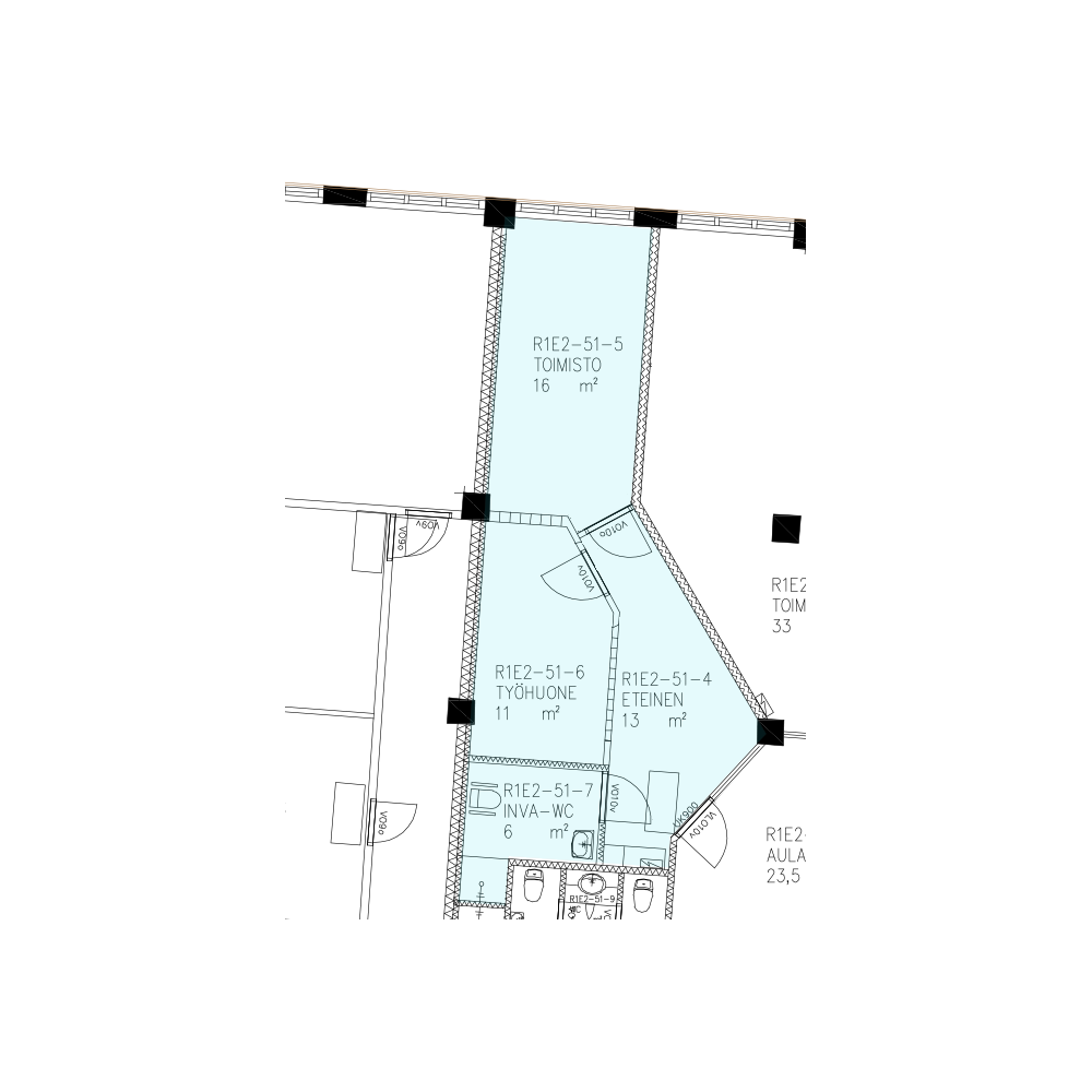 Toimistohuoneisto, jossa kaksi erillistä huonetta ja aula + wc-tilat. Toinen huoneista ikkunaton ja toisessa näkymät Mannerheiminkadun suuntaan. Ikkunattomassa huoneessa vesipiste. Yhteiskäyttökeittiö. Hissiyhteys E-portaasta.