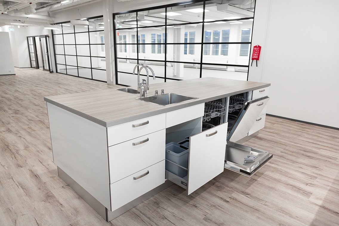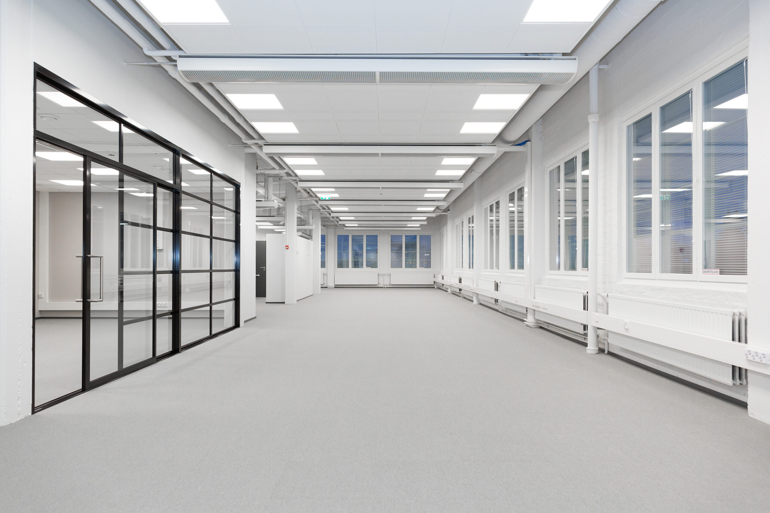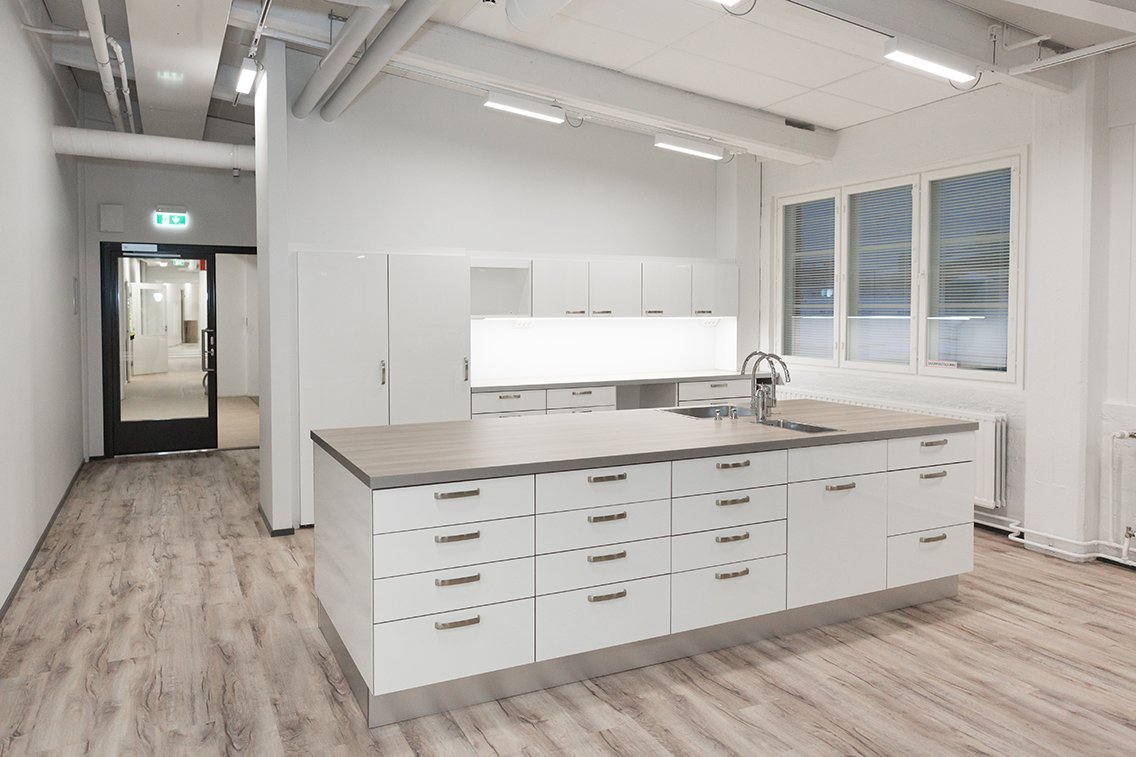 Askotalon ylimmässä kerroksessa sijaitseva valoisa toimistotila